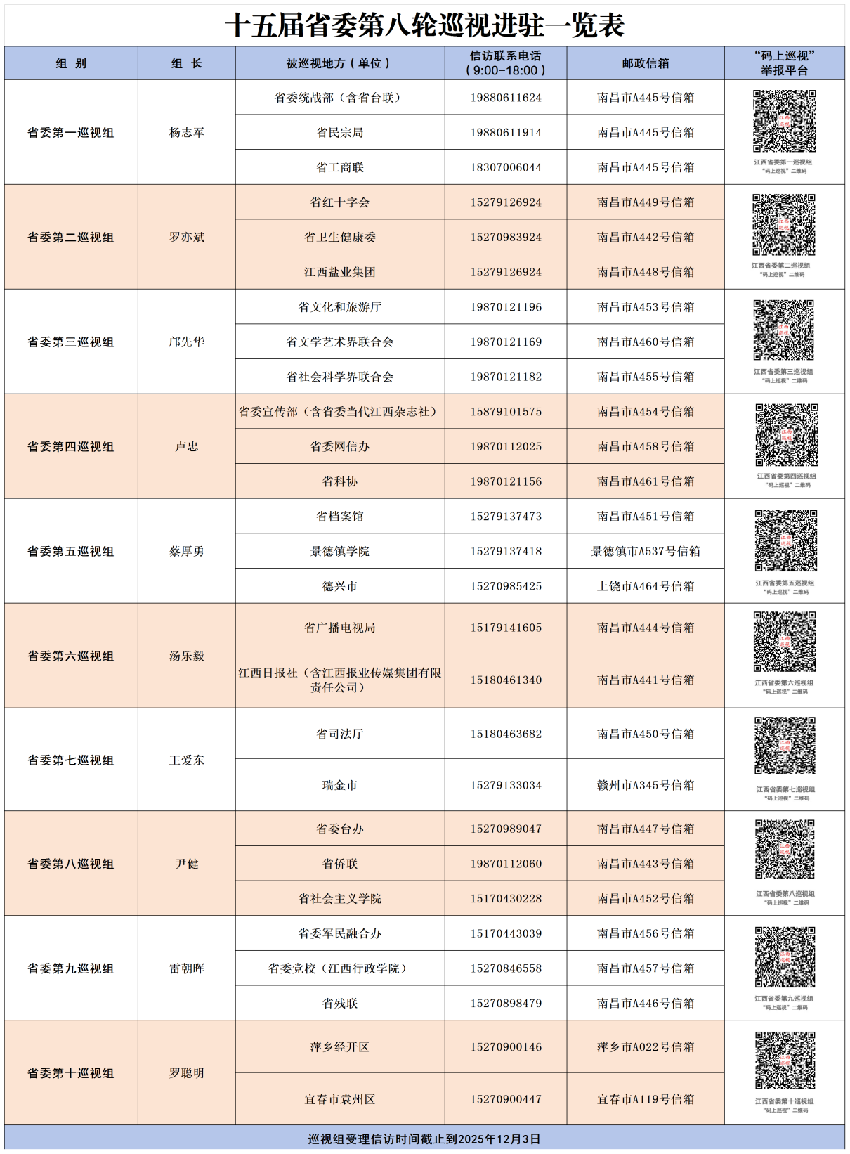 十五届省委第八轮巡视进驻一览表